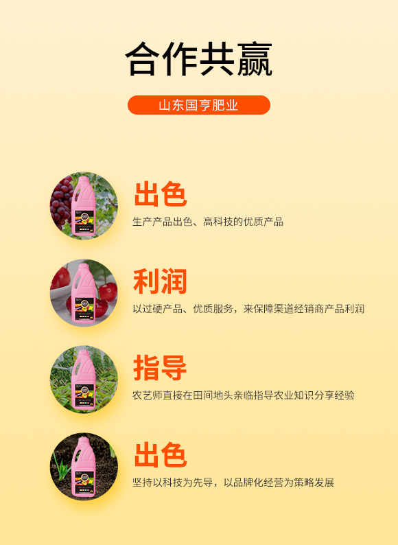 公司緊隨市場變化,關注肥料高新科技的發(fā)展趨勢,在國內(nèi)市場銷售的同時,也積極出口國外貿(mào)易。公司現(xiàn)有“國亨”“ 田園壯”兩大品牌,依托強勢的服務和強大的品牌理念,公司在不斷發(fā)展壯大。一直以來,公司總是處于時代的前列,超前發(fā)展的思想,始終占領市場競爭的至高點。