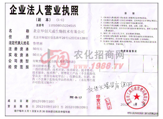 北京華創(chuàng)天威生物技術(shù)有限公司是北京高新技術(shù)企業(yè),由農(nóng)科院、農(nóng)業(yè)大學(xué)、專家、教授和經(jīng)驗豐富的實戰(zhàn)專家家定點農(nóng)藥生產(chǎn)企業(yè)組建而成,公司秉承:誠信,創(chuàng)新,快捷,克勝的經(jīng)營方針,堅持以開發(fā)推廣市場市場潮流的新成分,新劑型,高含量的產(chǎn)品為公司發(fā)展方向,始終以的經(jīng)營模式經(jīng)銷商在殘酷市場中快速發(fā)展,為中國農(nóng)業(yè)豐產(chǎn)、豐收而努力奮斗。