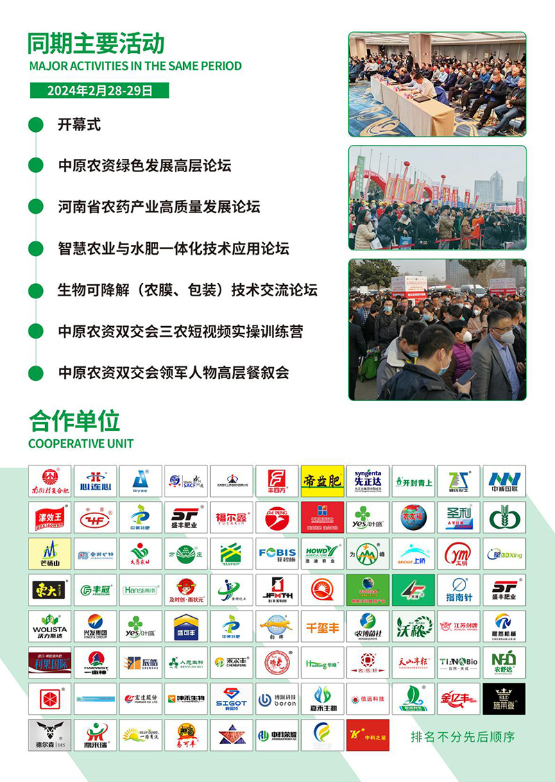 以上就是2024第21屆中原農(nóng)資雙交會(huì)展會(huì)亮點(diǎn)的簡單介紹,2月28-29日,讓我們相約鄭州國際會(huì)展中心,共聚第二十一屆中原農(nóng)資雙交會(huì)!
